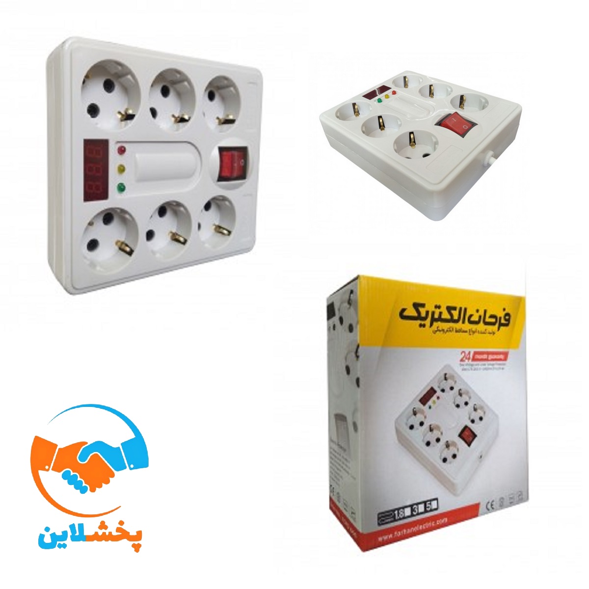 یکی از محصولات شرکت فرحان الکتریک محافظ برق 6 پریز ارت دار  می باشد. این وسیله لوازم صوتی و تصویری و کامپیوتر را در برابر قطع و وصل و نوسانات شدید برق محافظت می نماید.بعد از وصل کردن محافظ به برق شهر چراغ زرد به علامت زمان تاخیر روشن و پس از پایان زمان تاخیر که حدود1 دقیقه است، چراغ زرد خاموش و چراغ سبز به علامت برق دار شدن پریزها روشن  میشود. در صورت افت ولتاژ یا افزایش ولتاژ از حد مجاز پریزها بطور اتوماتیک بدون برق شده و چراغ قرمز روشن می شود.پس از رسیدن ولتاژ به حد مجاز، چراغ قرمز خاموش و چراغ زرد روشن شده و پس از گذشت زمان تاخیر چراغ سبز همزمان با برق دار شدن پریزها روشن خواهد شد. طول کابل محافظ لوازم صوتی و تصویری و کامپیوتر فرحان الکتریک 3 متر می باشد. مدت زمان تاخیر 1 دقیقه و فرکانس ورودی آن نیز 50 هرتز می باشد.