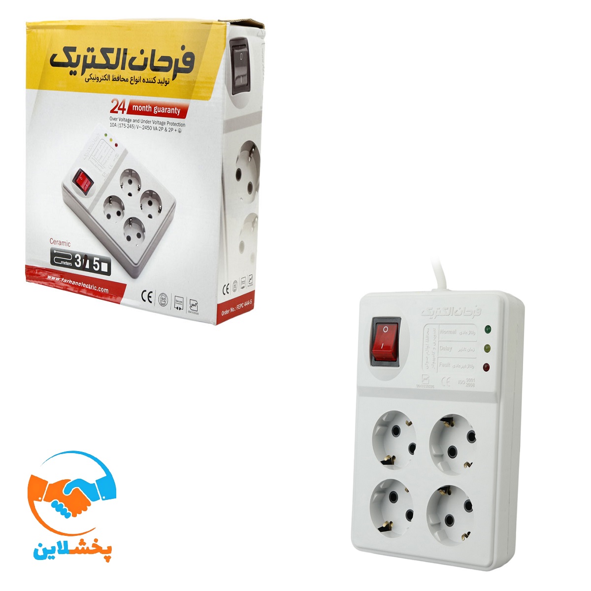 یکی دیگر از محصولات شرکت فرحان الکتریک محافظ برق 4 پریز ارت دار با مغزی سرامیکی می باشد. این وسیله لوازم صوتی و تصویری و کامپیوتر را در برابر قطع و وصل و نوسانات شدید برق محافظت می نماید.بعد از وصل کردن محافظ به برق شهر چراغ زرد به علامت زمان تاخیر روشن و پس از پایان زمان تاخیر که حدود1 دقیقه است، چراغ زرد خاموش و چراغ سبز به علامت برق دار شدن پریزها روشن  میشود. در صورت افت ولتاژ یا افزایش ولتاژ از حد مجاز پریزها بطور اتوماتیک بدون برق شده و چراغ قرمز روشن می شود.پس از رسیدن ولتاژ به حد مجاز، چراغ قرمز خاموش و چراغ زرد روشن شده و پس از گذشت زمان تاخیر چراغ سبز همزمان با برق دار شدن پریزها روشن خواهد شد. طول کابل محافظ لوازم صوتی و تصویری و کامپیوتر فرحان الکتریک 3 می باشد. مدت زمان تاخیر 1 دقیقه و فرکانس ورودی آن نیز 50 هرتز می باشد.